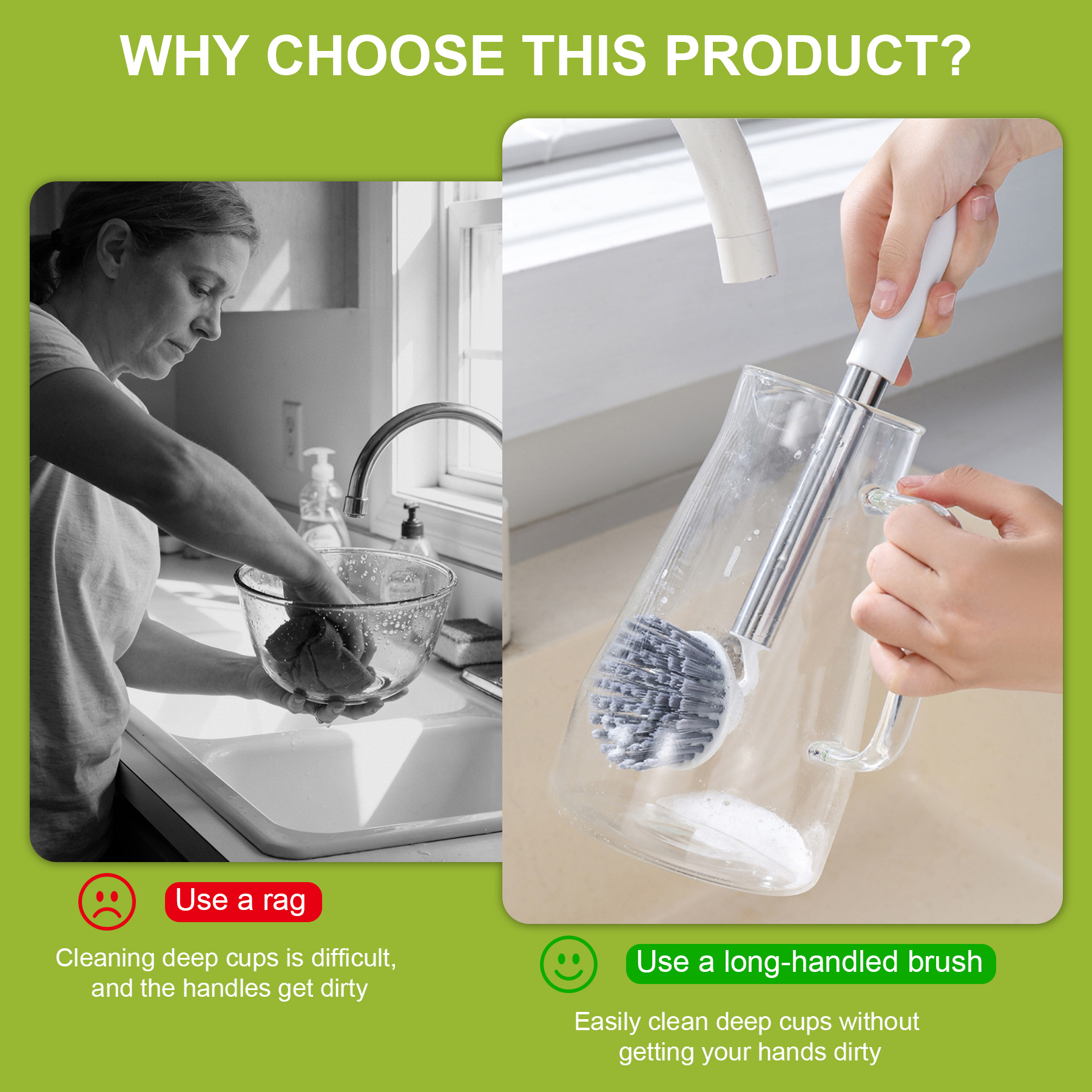 Safety Features: Long handle keeps hands away from soap and grease
